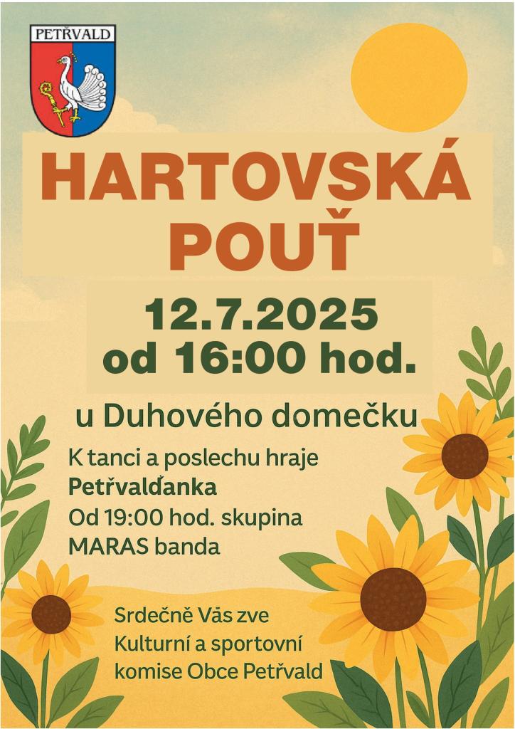 Přijďte na Hartovskou pouť, která se koná 12. července 2025 od 16:00 hodin u Duhového domečku. Čeká na vás zábava a hudba pro všechny, kdy se můžete těšit na vystoupení skupiny Petřvaldanka, která zahraje k tanci a poslechu. Od 19:00 hodin se na pódiu představí skupina MARAS banda. Přijďte si užít krásné odpoledne plné hudby a tance!